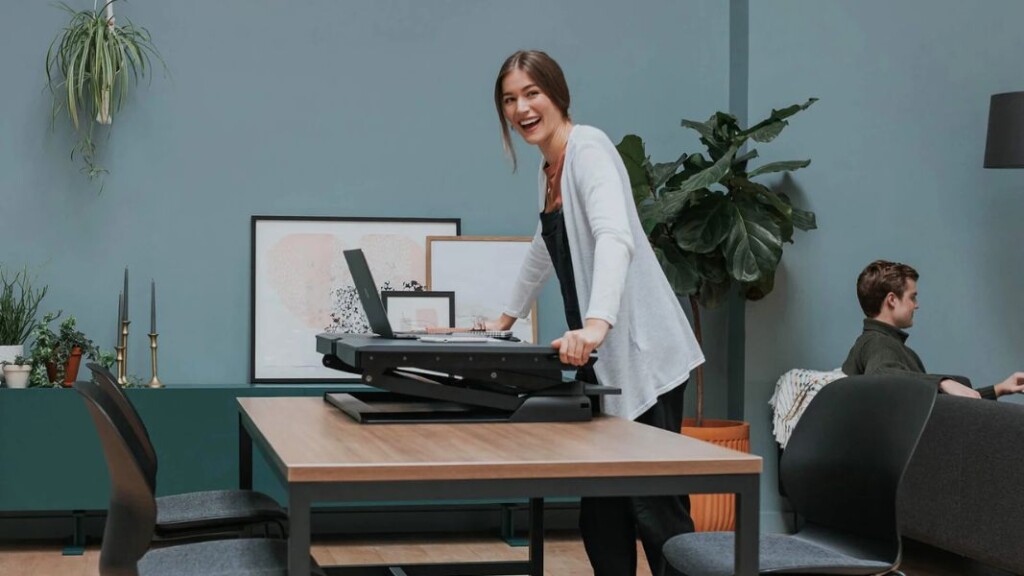 Haworth’s converters turn any tabletop into an ergonomic sit-to-stand setup in seconds.