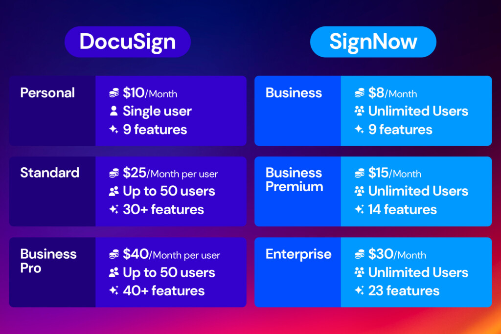 SignNow and Docusign differ in pricing models: Docusign prices by users and features, while SignNow includes unlimited users and bases prices on features alone.